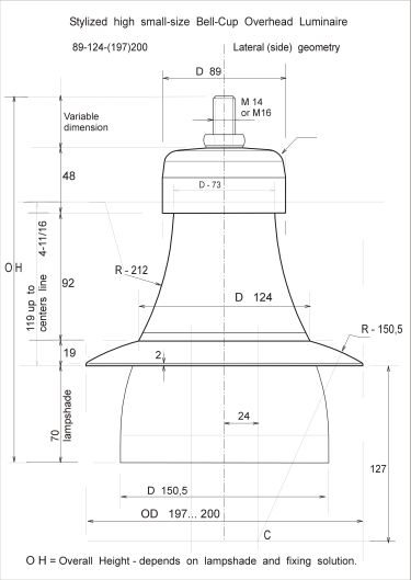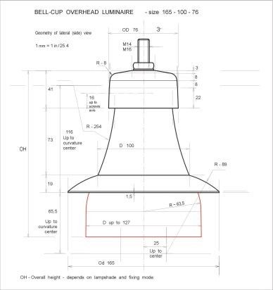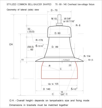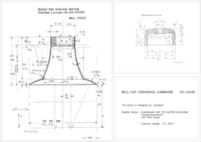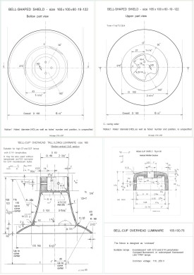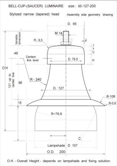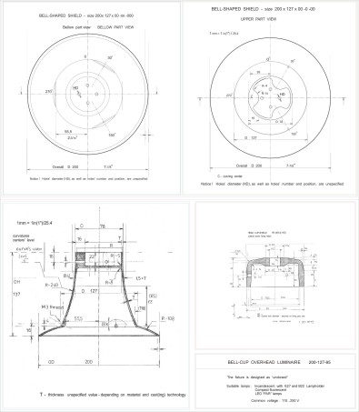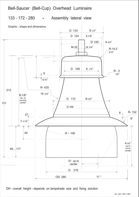 TERMS OF DESIGNS USAGEThe main term of mechanical drawings usage, which represents luminaries component parts, for manufacturing, is to be used as they are designed. If our design is not suitable for your way of manufacturing, or concept, you may modify in your way - as you consider more suitable for you - only the interior (inside) part(s) (components) of the luminaries ; preserving the outside shapes and dimensions. Any kind of changes are allowed to all components or solutions, which are hidden in the assembled luminaire. More exactly, you have to keep the outside of luminaries untouched. Any kind of hacking, or combinations of your own solutions, which change the outside shape and dimensions of the assembly of the luminaire, are forbidden. The below part of 'Bell-(Cup)-Saucer' Luminaires (as body of fixture or as lampshade), may be considered as "inside", too. Therefore, any changes are allowed on all below parts, which are above the horizontal lowest plane of the saucer-shaped-shield, or on those of lampshield (inside of lampshade). NOTICE ! Anytime, if there are more suggested values for the same dimension, the manufacturer may chose those, which he considers more suitable. On drawings which show both dimensions' values in millimeters and inches, usually, values in millimeters are written on the left, or upside, and those in inches are mentioned on right, or down one. |